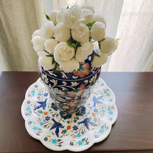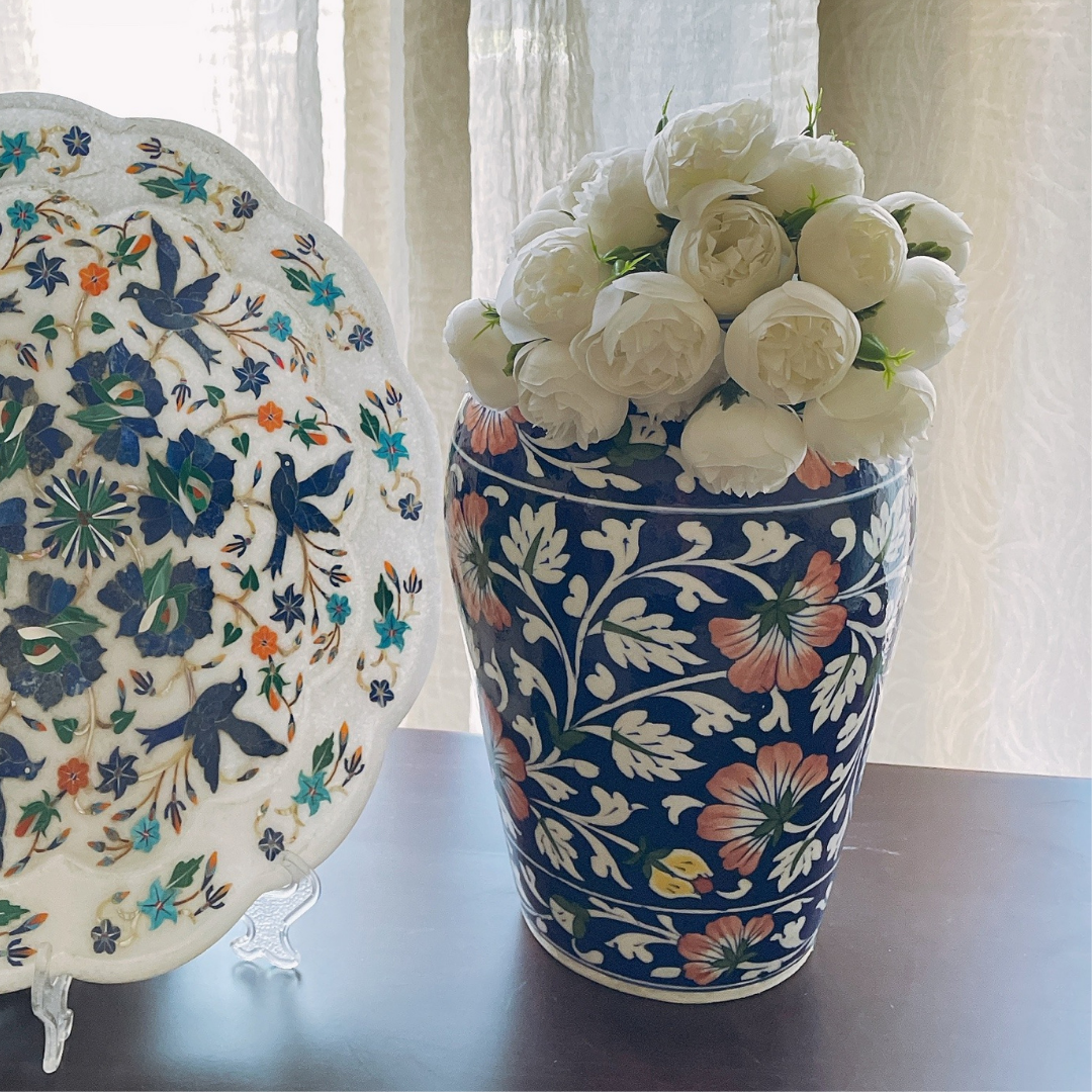 This flower vase is an outstanding example of Jaipur blue pottery. The absence of clay in this pottery makes it very fragile, so be careful with it. Store your fresh blooms in this highly vibrant vase. It should occupy a prime slot on your display case. So much more than a vase, a playfully designed blue and white pottery art piece is a chic minimal add-on to the beauty of your room.