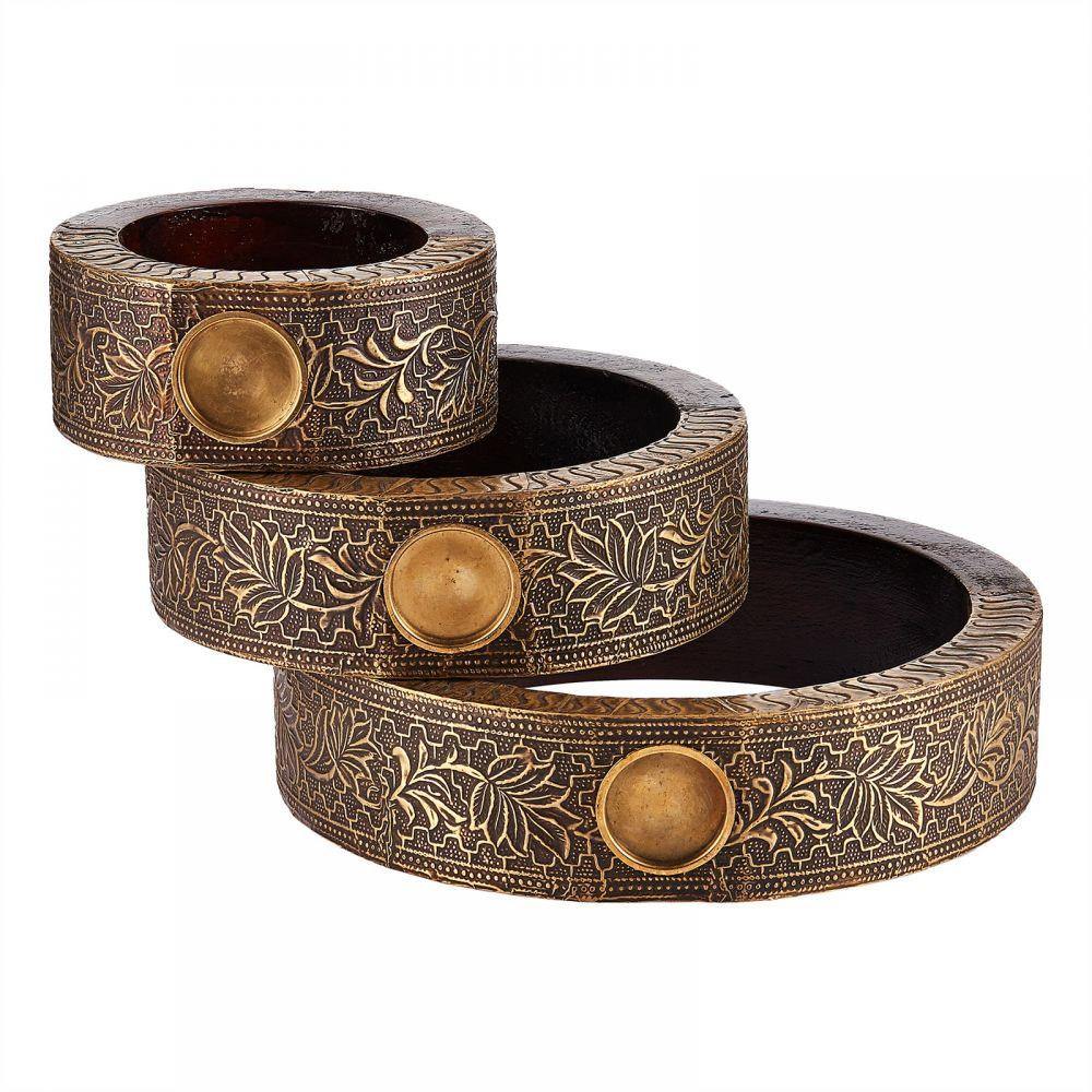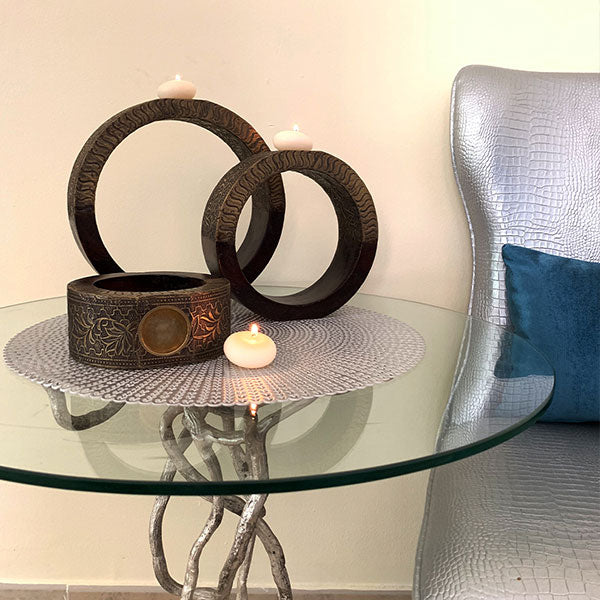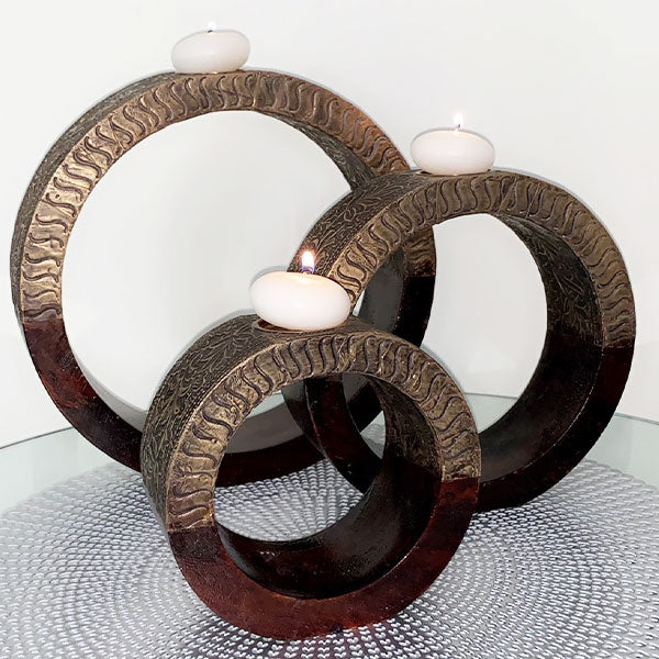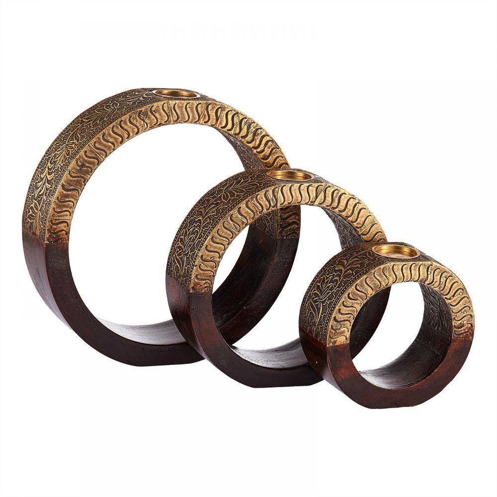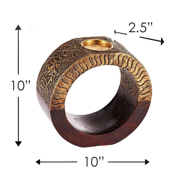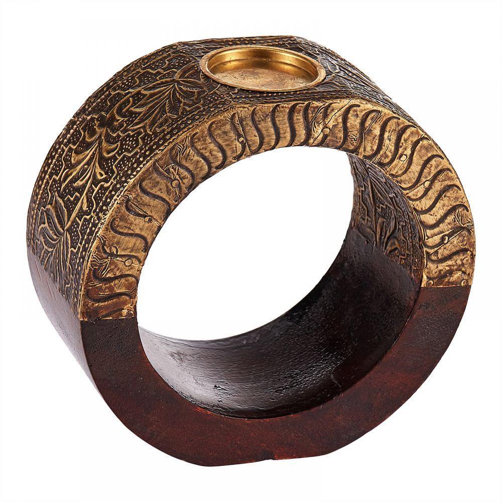 This intricately designed wooden candle holder with brass fitting adds a rustic touch to your home.