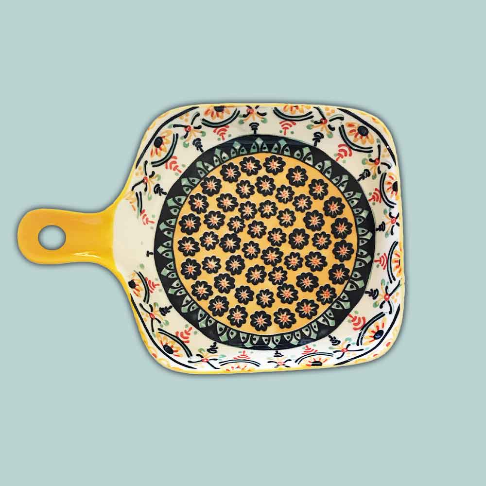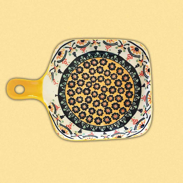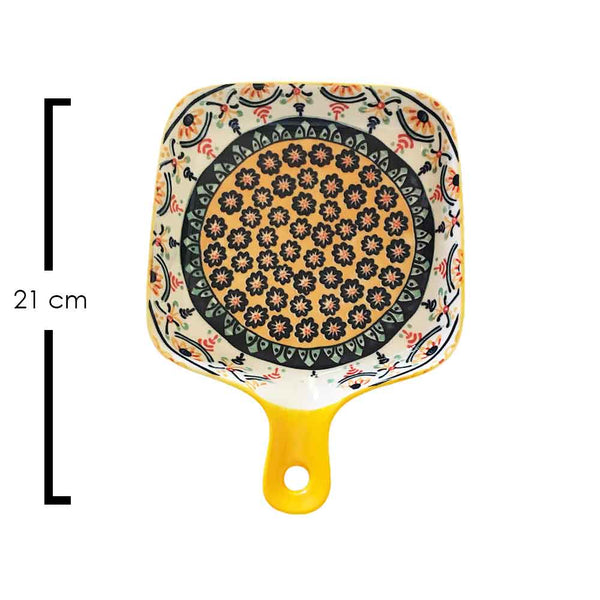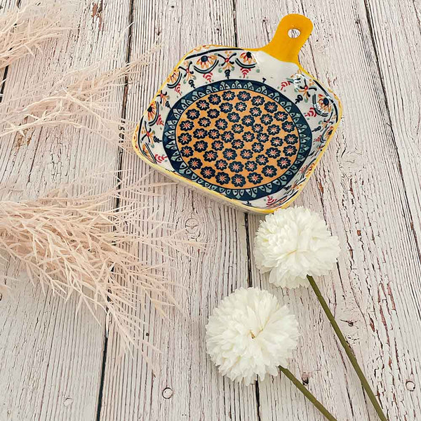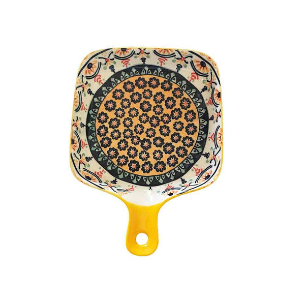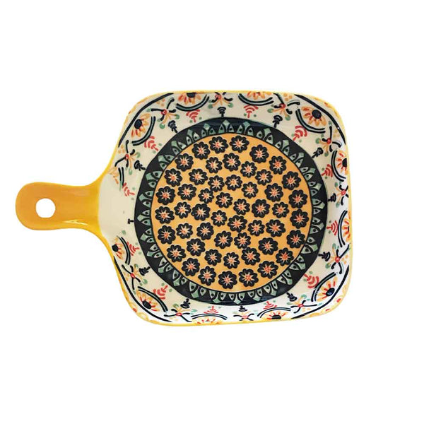 Yellow Floral square serving pan bowl with handle is perfect to serve rice, soup, or any side dishes. Add this beautifully handcrafted serving bowl to your crockery collection.