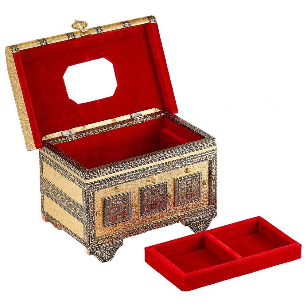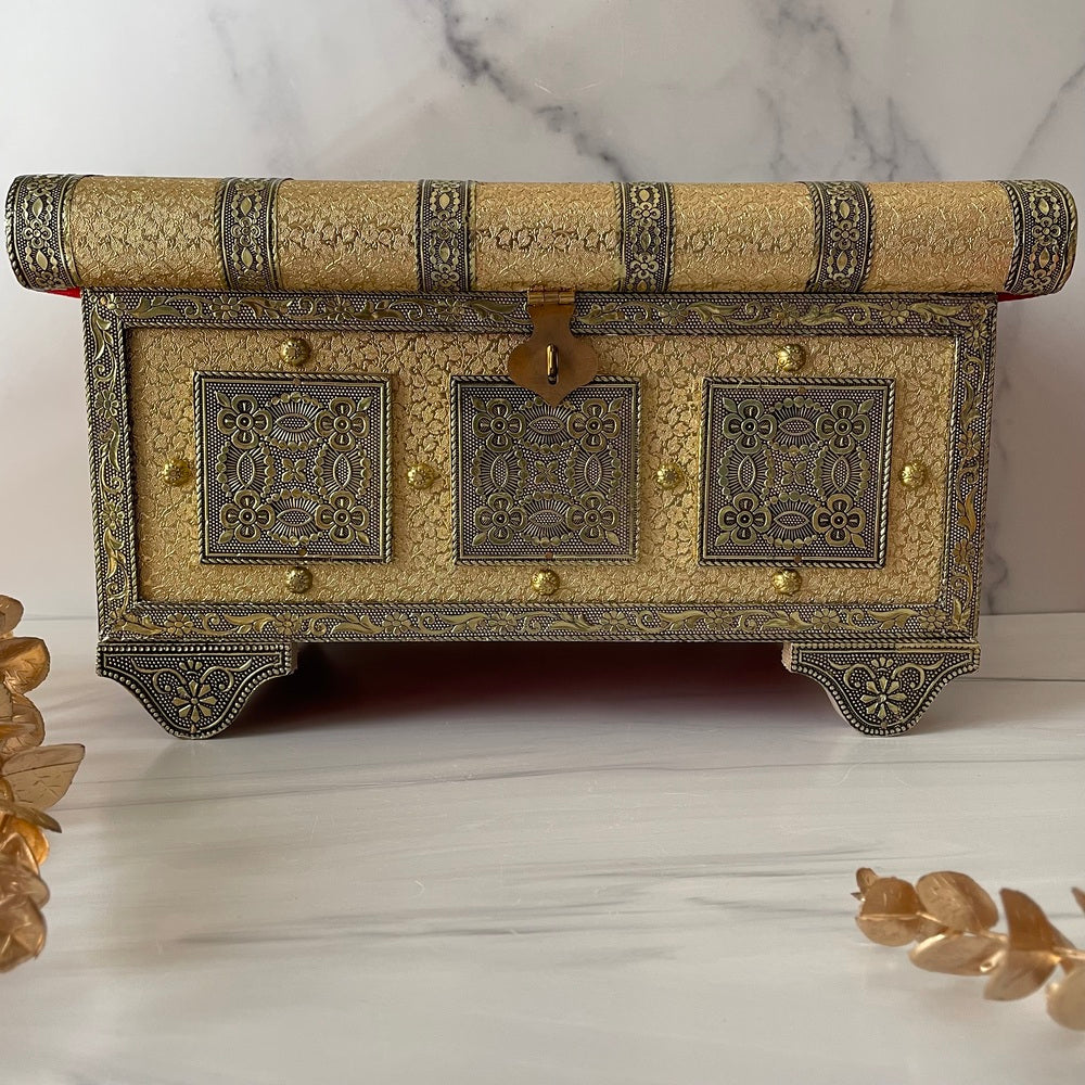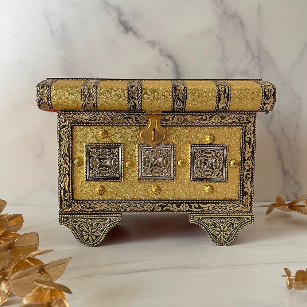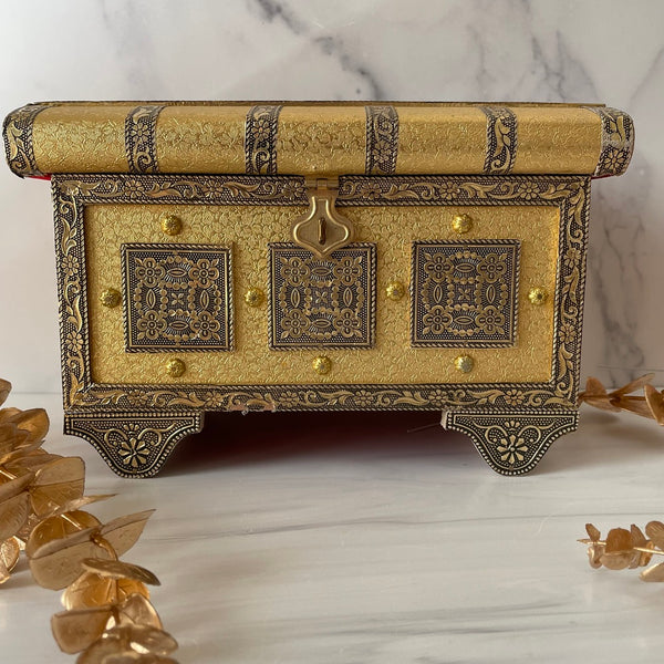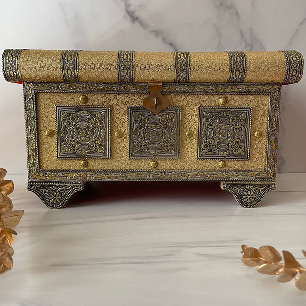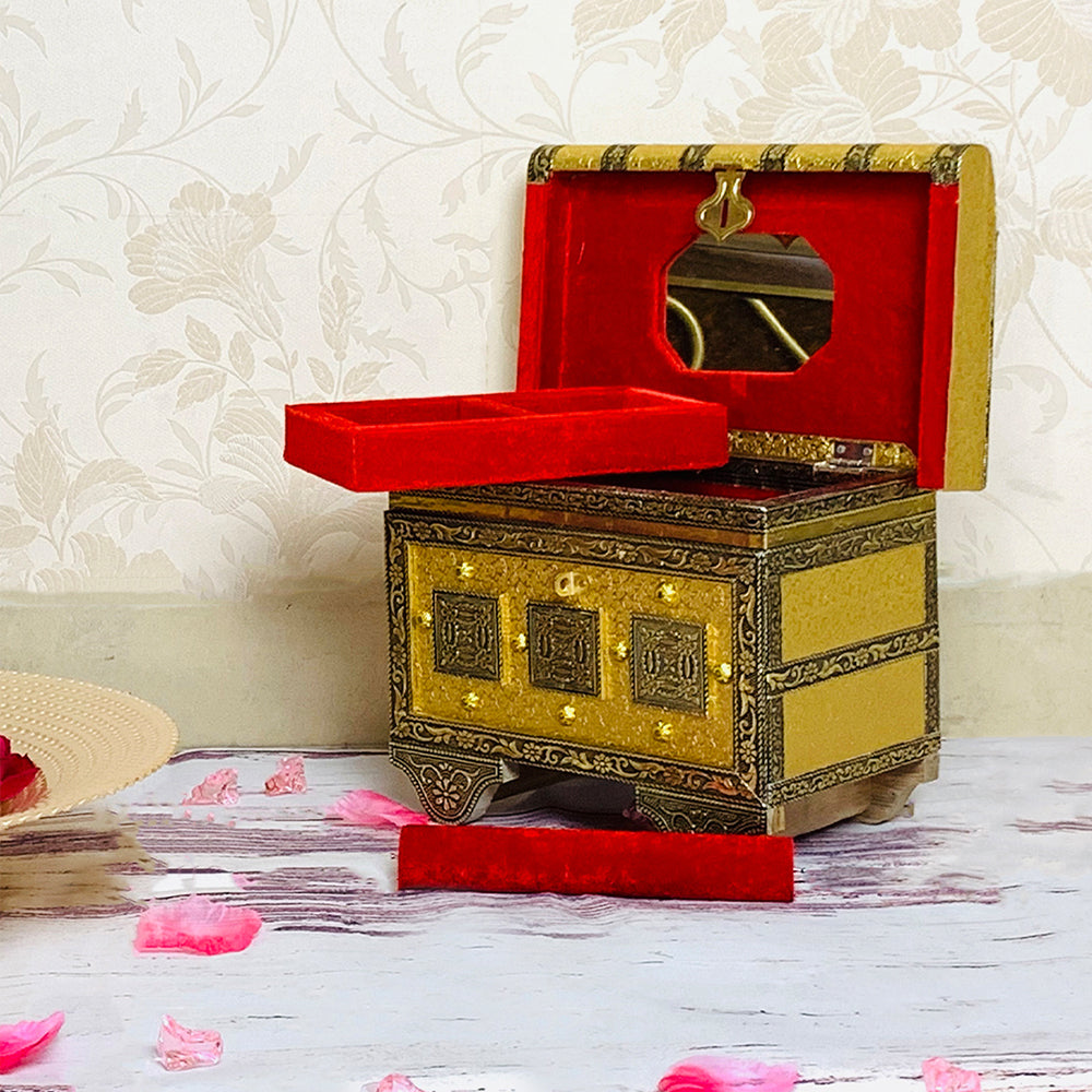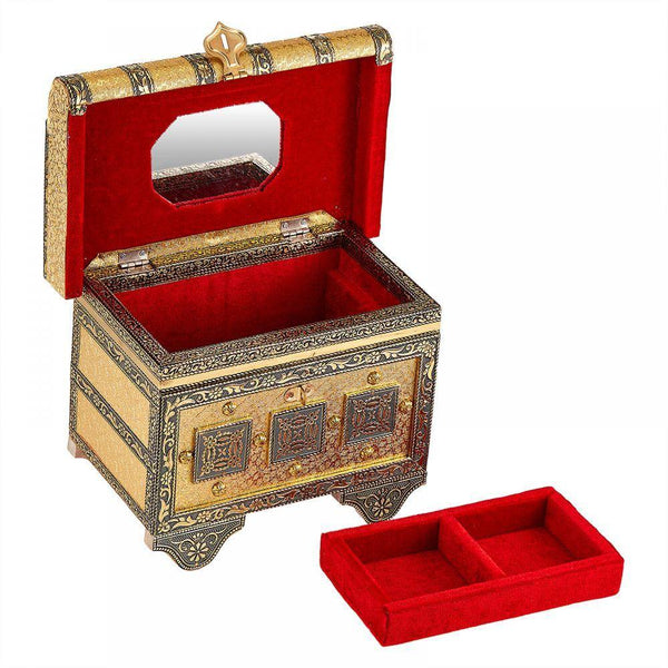 A beautiful jewelry box made of embossed gold metal and the inner is lined with rich velvet fabric. On the inside, there is a mirror, a base section, and a bangle holder role.