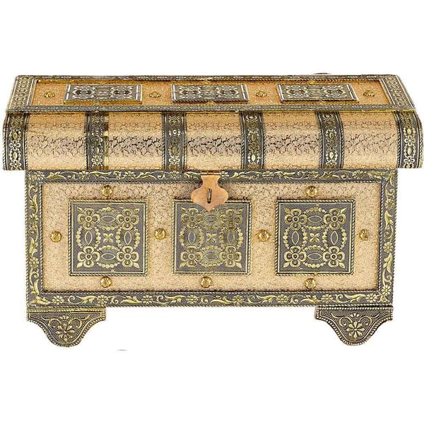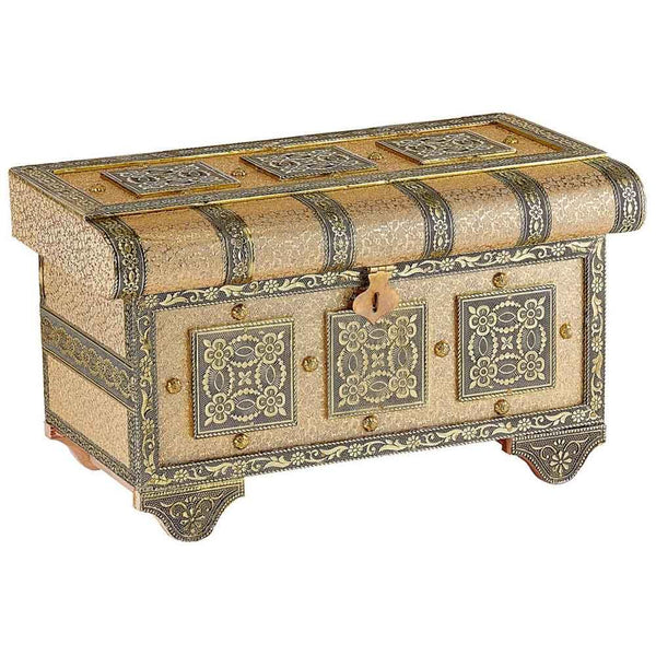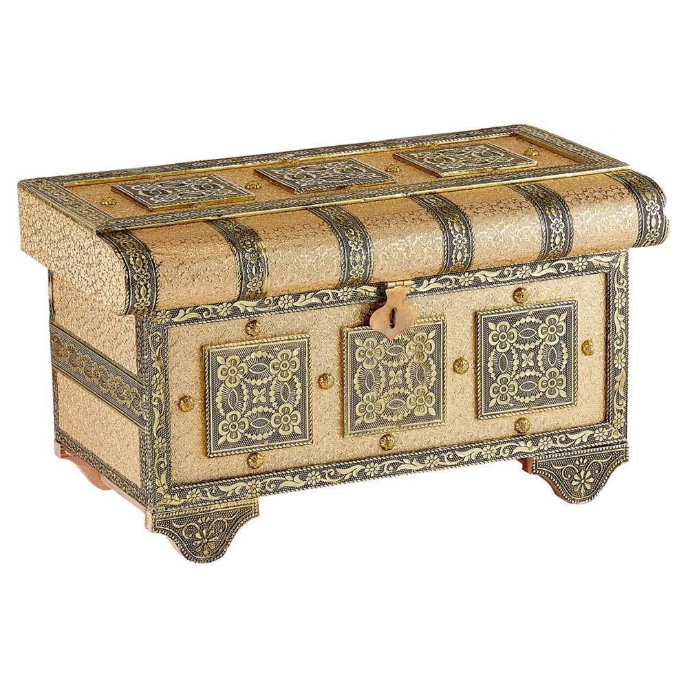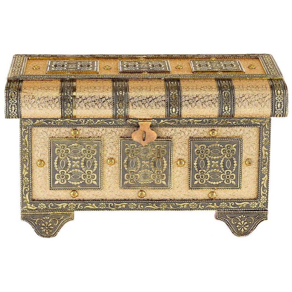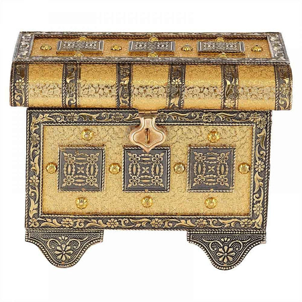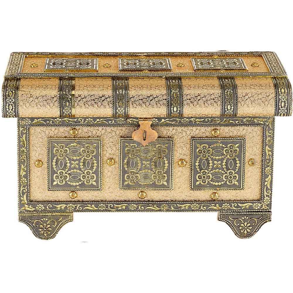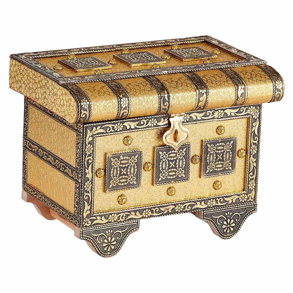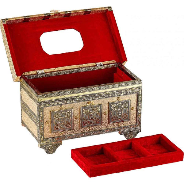 A beautiful jewelry box made of embossed gold metal and the inner is lined with rich velvet fabric. On the inside, there is a mirror, a base section, and a bangle holder role.
