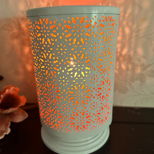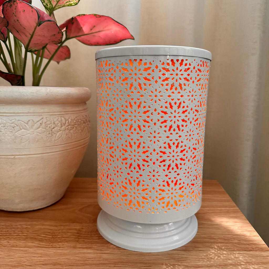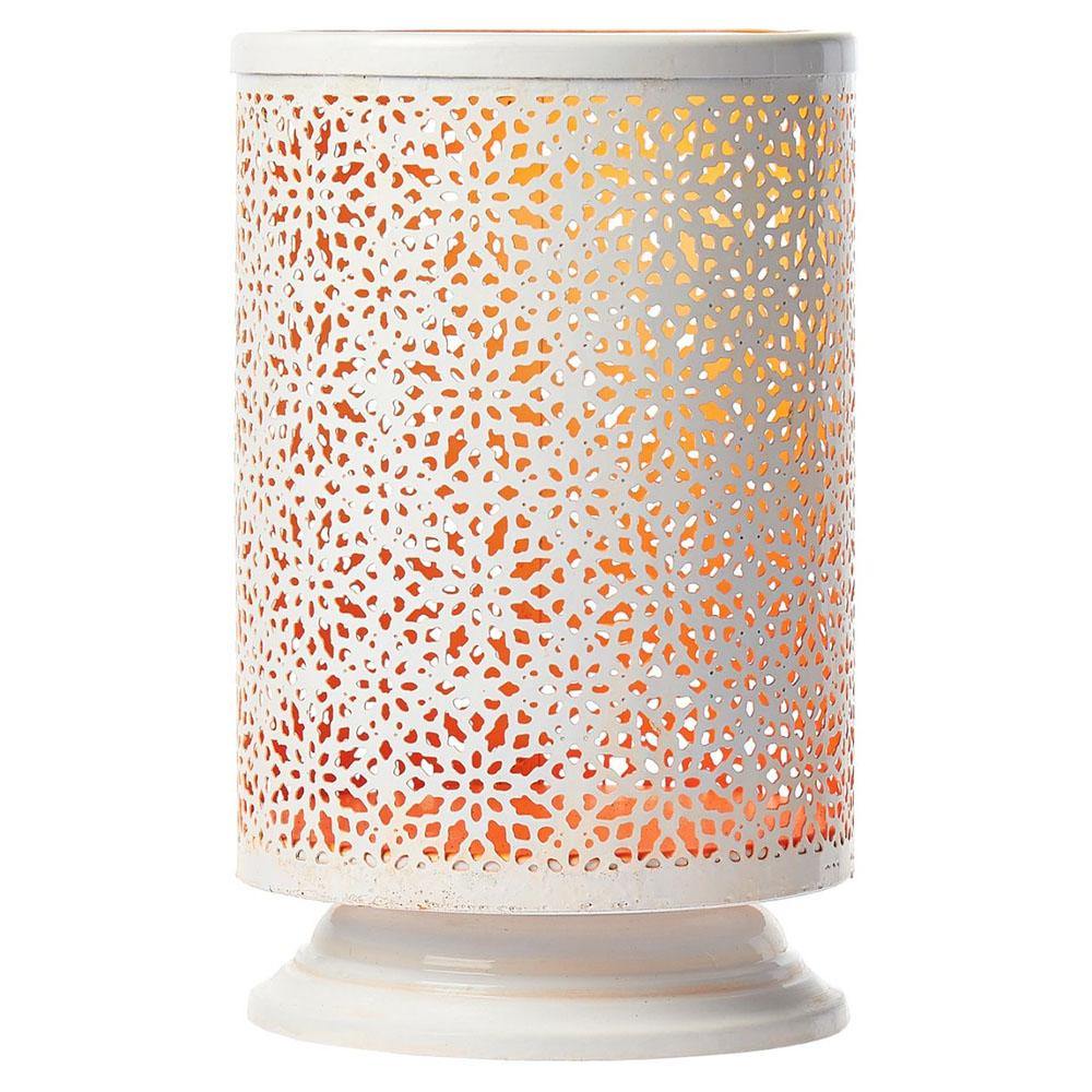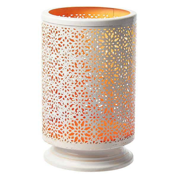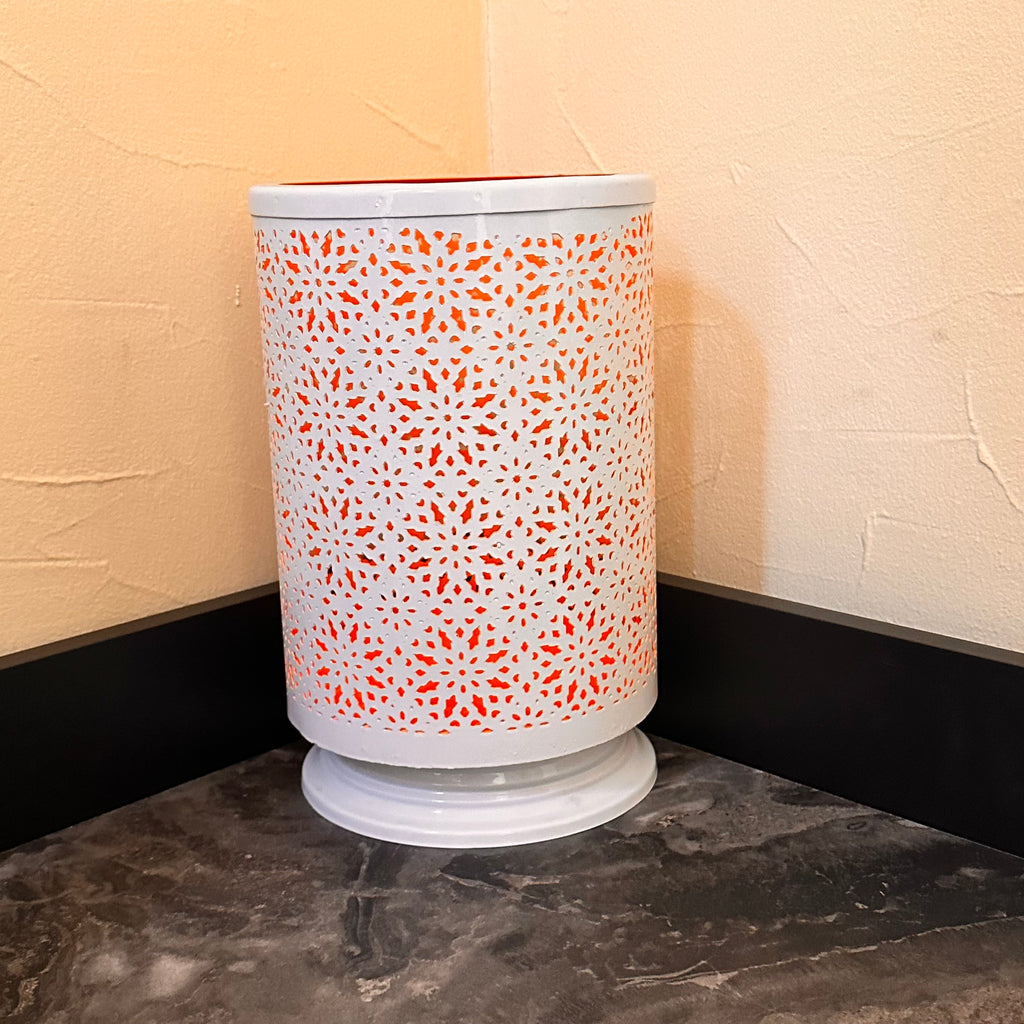 This round tall metal votive candle holder adds warm ambient lighting to your living space. Made of metal, this lovely luminary features a laser cut design that allows light to shine through.